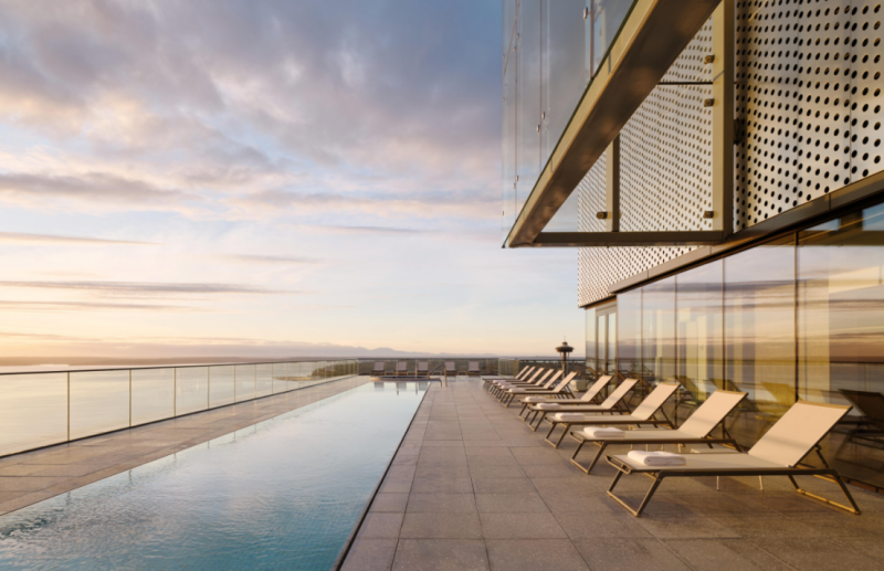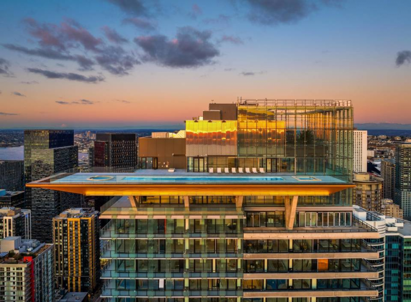 47层天际会所配有西海岸唯一的天际泳池,站在西雅图市中心最高点,270°环幕视野尽享城市及海湾的壮丽美景,无论是清晨的阳光还是落日的余晖,在此享受生活。
