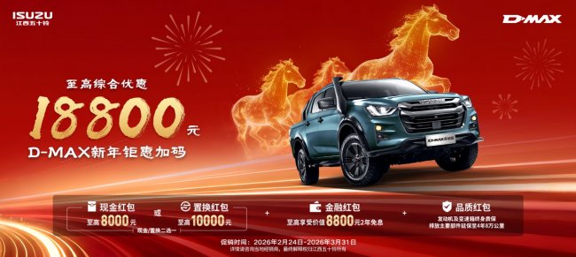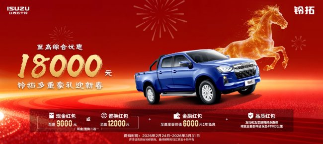 春节假期已过,奋斗的序幕正徐徐拉开。无论你是刚刚返岗的追梦人,还是准备大干一场的创业者,江西五十铃皮卡携重磅福利为你加油助力——即日起至3月31日,购全系皮卡车型可享至高18800元综合优惠,现金红包、置换补贴、金融免息、终身质保等多重豪礼齐派送,助你马力全开,赢战新程!