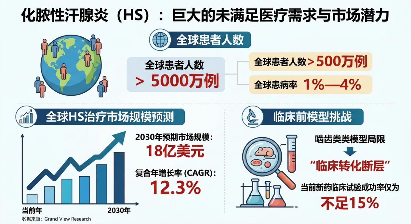 化脓性汗腺炎(HS,Hidradenitis Suppurativa)是一种慢性、复发性、疼痛性及毁容性的炎症性皮肤疾病,全球患病率约1%—4%,患者人数超过5000万例。该疾病以反复发作的脓肿、结节、窦道及畸形瘢痕为特征,年均医疗费用达8000—15000美元/患者(发达国家数据),给全球医疗体系带来沉重负担。当前HS药物研发面临的核心瓶颈在于——缺乏具有高度临床转化价值的动物模型。